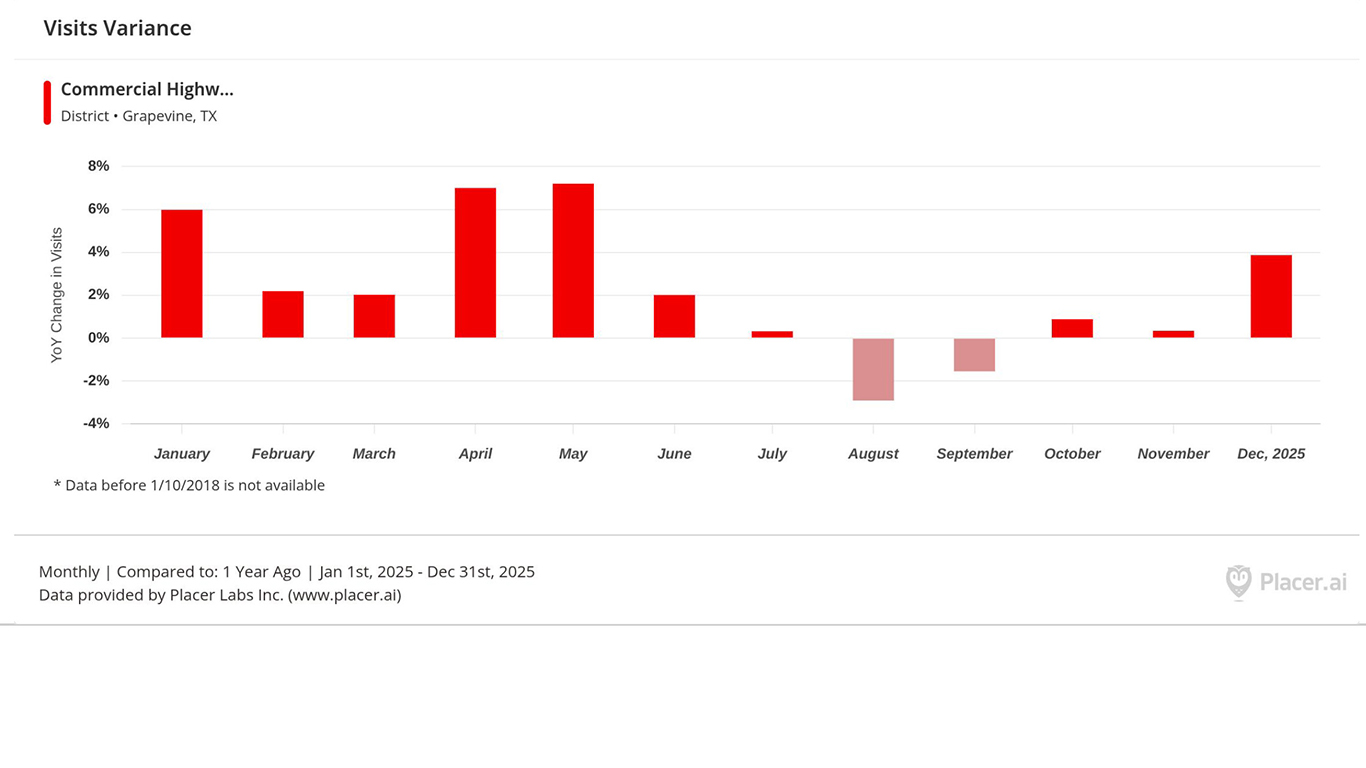 - Multi-Month Improvement. The District recorded YoY growth in 10 of 12 months throughout 2025, with the only drop-offs being August (-3%) and Sept (-1%). The year-round visits trend was fairly steady at around a quarter-million per week, peaking at 330k just before Christmas.